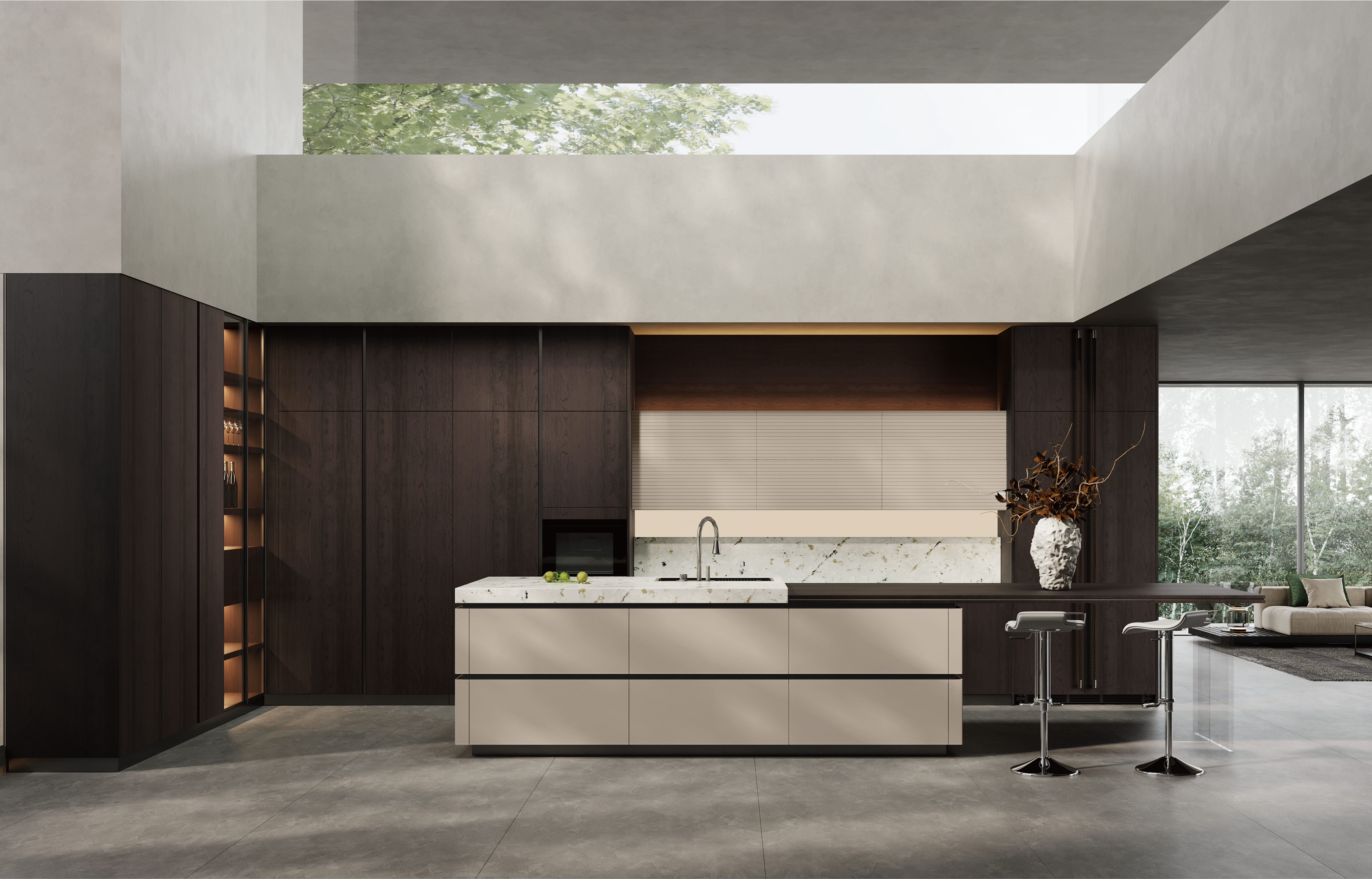 通过一竞技厨柜量体裁柜,定制出适合主厨下厨的烹饪区和洗涤区的舒适高度。